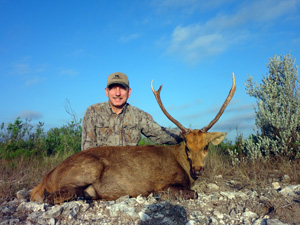 The W4 is home to over 20 species of introduced exotic wildlife. Large breeding herds abound and a typical day will produce sightings of hundreds of animals. Exotic hunting can be done year round and offers a great opportunity to get in to the field during the long off season. Many of the species hunted on the W4 can no longer be hunted in their native range and in some cases these species are far more numerous on Texas ranches than in their native land. The W4 is large enough and the habitat is suitable to offer a challenging fair chase hunt. Exotic species can be hunted on a trophy fee only basis during our whitetail hunts or may be hunted anytime by paying a reasonable daily rate for guide service, meals and lodging. Individual trophy fees will be charged for any exotics harvested.